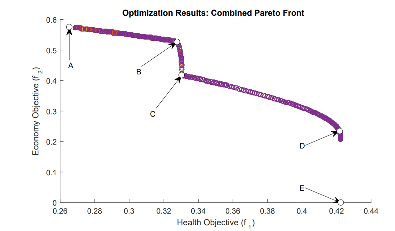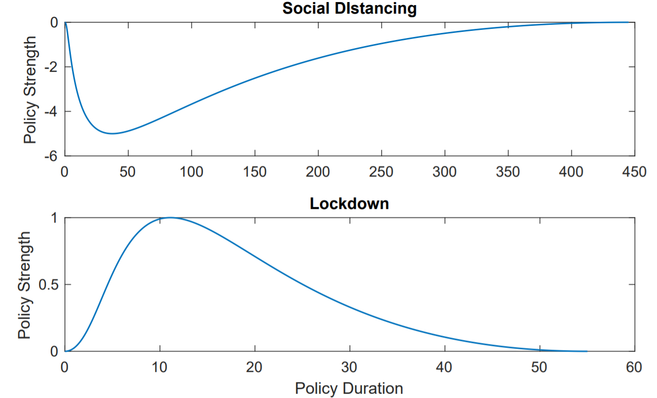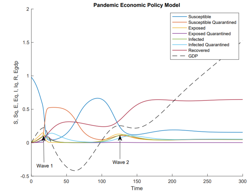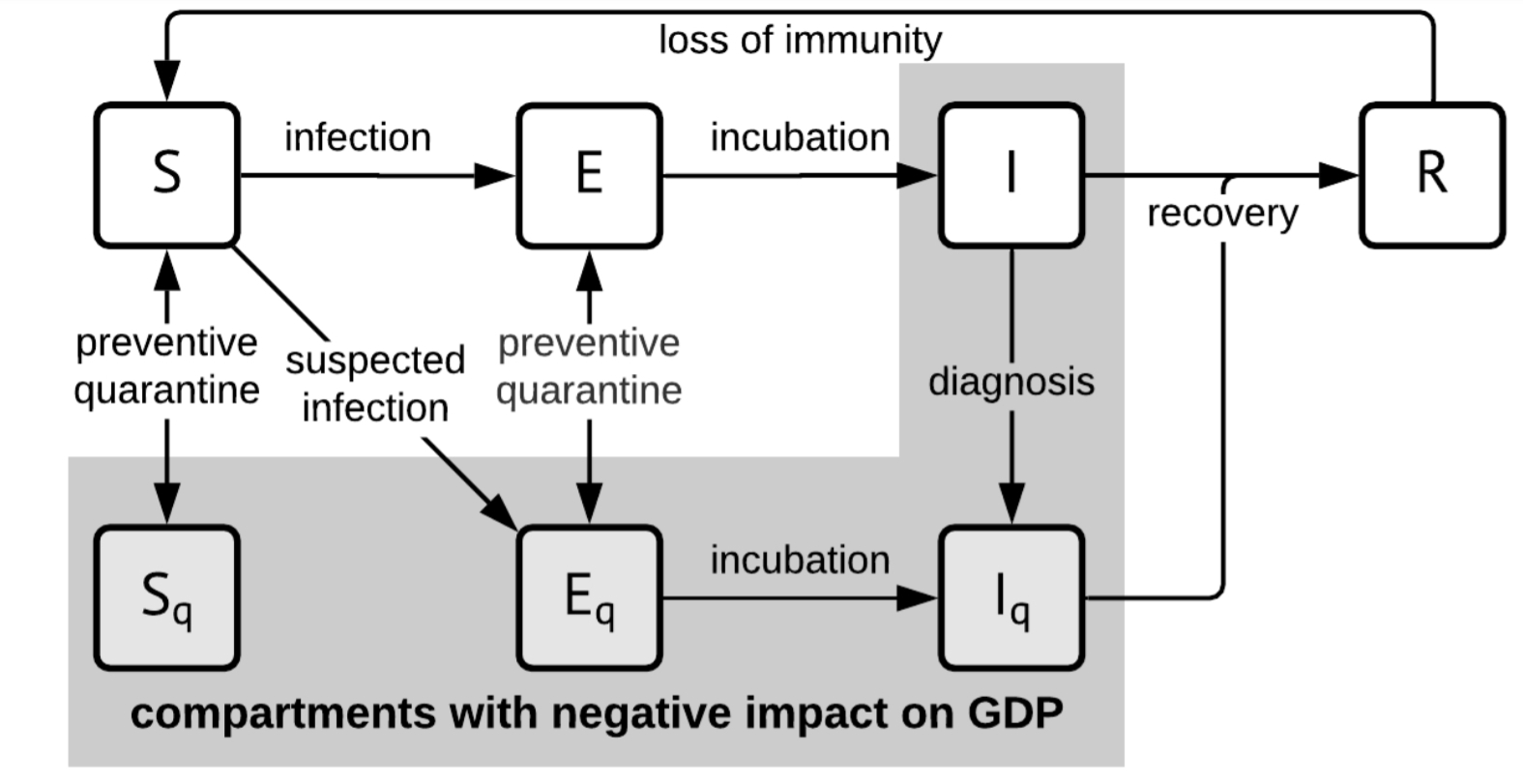 \begin{aligned} GDP' = b_{g} - p_{i}\,(\,p_{q\,i}\,S_{q}\:+\:e_{q\,i}\,E_{q}\:+\:i_{i}\,I\:+\:i_{q\,i}\,I_{q}\,),\\ \end{aligned} \begin{align*} & where\\ & b_{g} - GDP\:growth\:indicator\:at\:the\:beginning\:of\:pandemic,\\ & p_{i} - coefficients\:of\:the\:pandemic\:impact\:on\:GDP,\\ &S_{q},\,E_{q},\,I,\,I_{q} - share\:of\:quarantined\:individuals,\:\\ &at\:any\:stage\:of\:virus\:development,\:\, as\:well\:as\:share\:of\:the\:infected,\\ & p_{q\,i},\,e_{q\,i},\,i_{i},\,i_{q\,i} - coefficients\:which\:define\:the\:impact\:of\:the\:quarantined\:and\:infected\\ \end{align*}