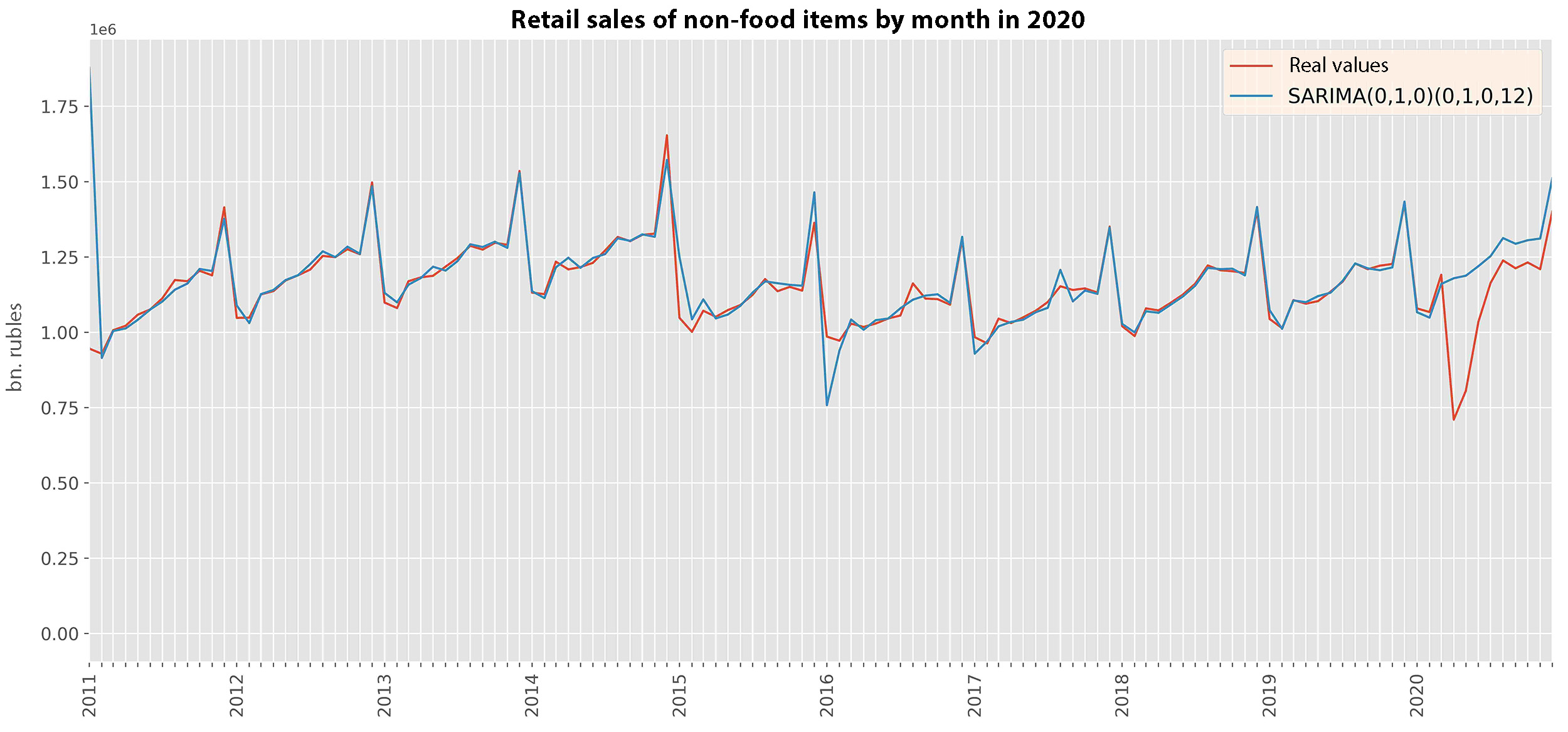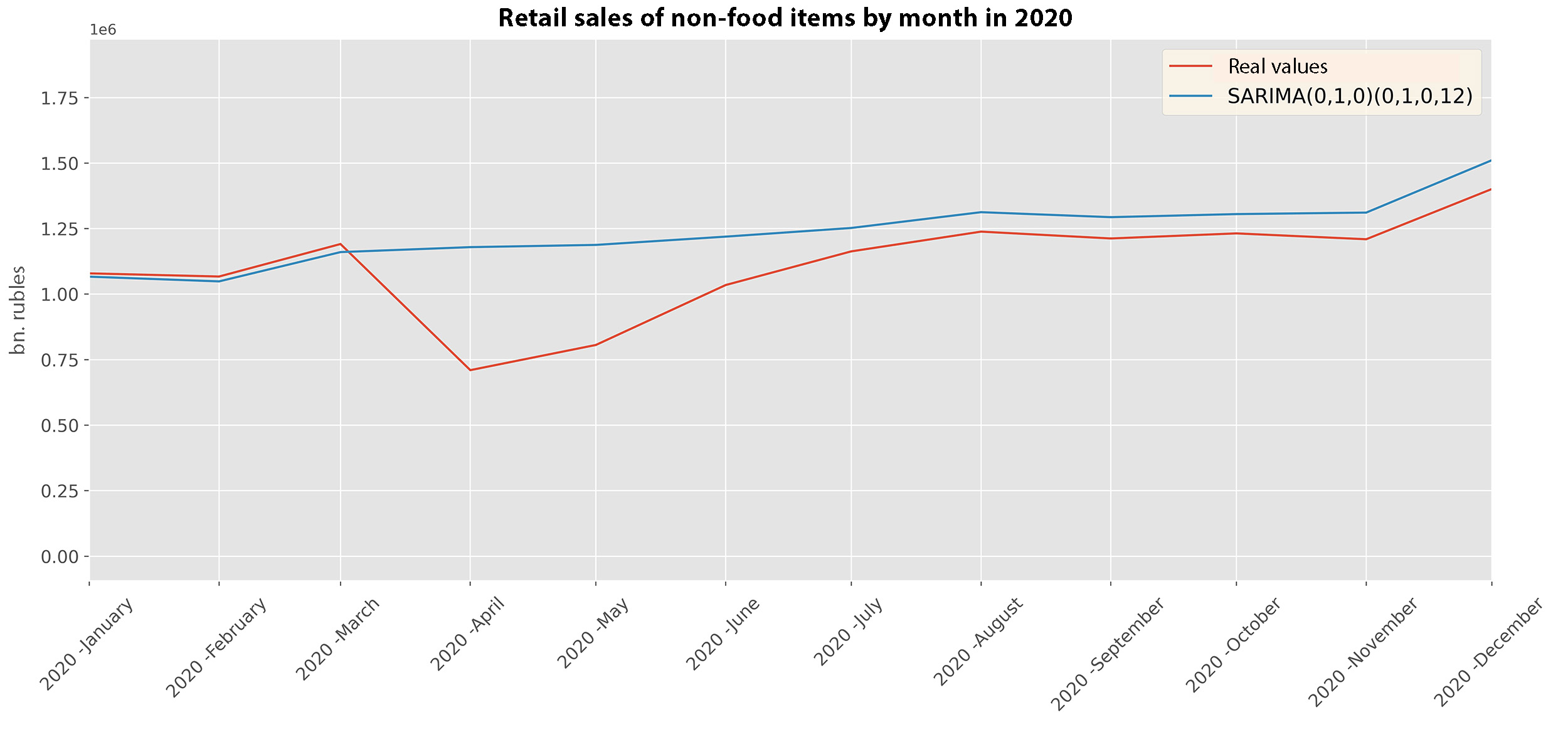 \begin{aligned} S_{t}\,(\,C\,=\,1\,)\,-\,S_{t}\,(\,C\,=\,0),\\ \end{aligned} \begin{align*} & where\\ &S_{t} - sales\:volume\:at\:t\:point,\\ &C - indicator\:of\:the\:impact\:of\:COVID−19.\\ \end{align*}
